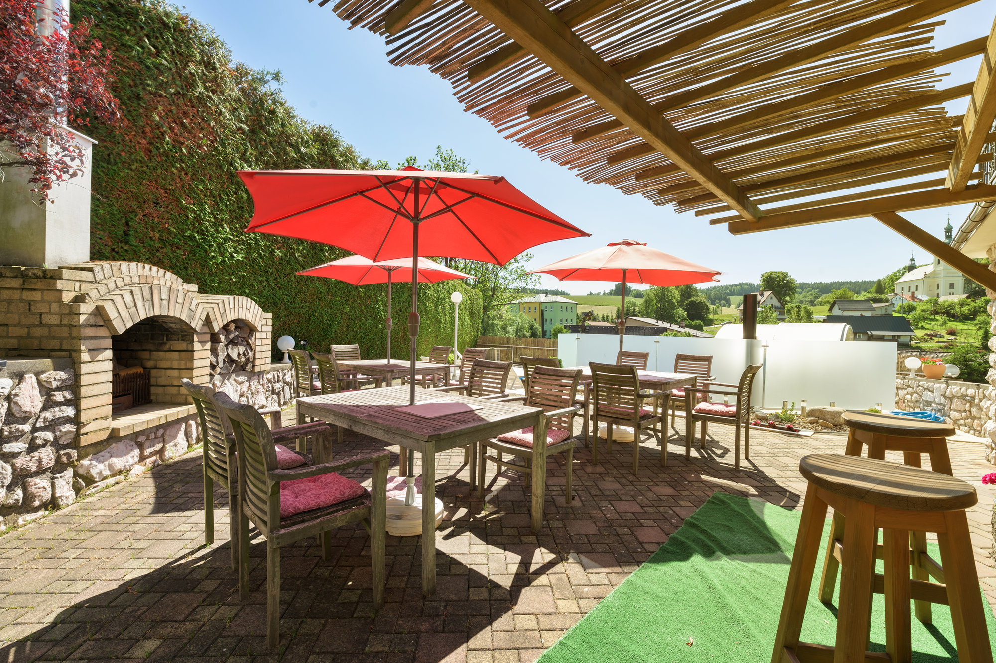 Z restaurace výhled francouzským oknem do přírody a na místní kostel.