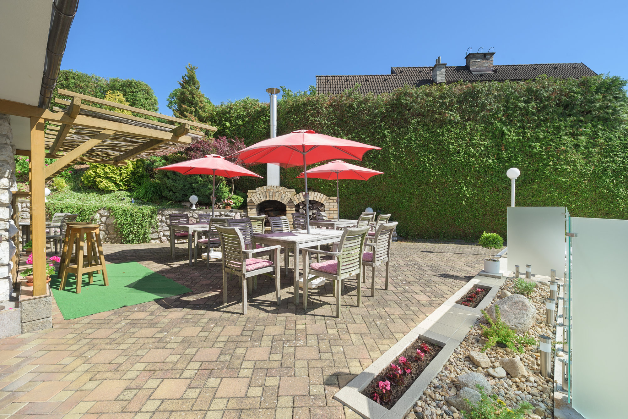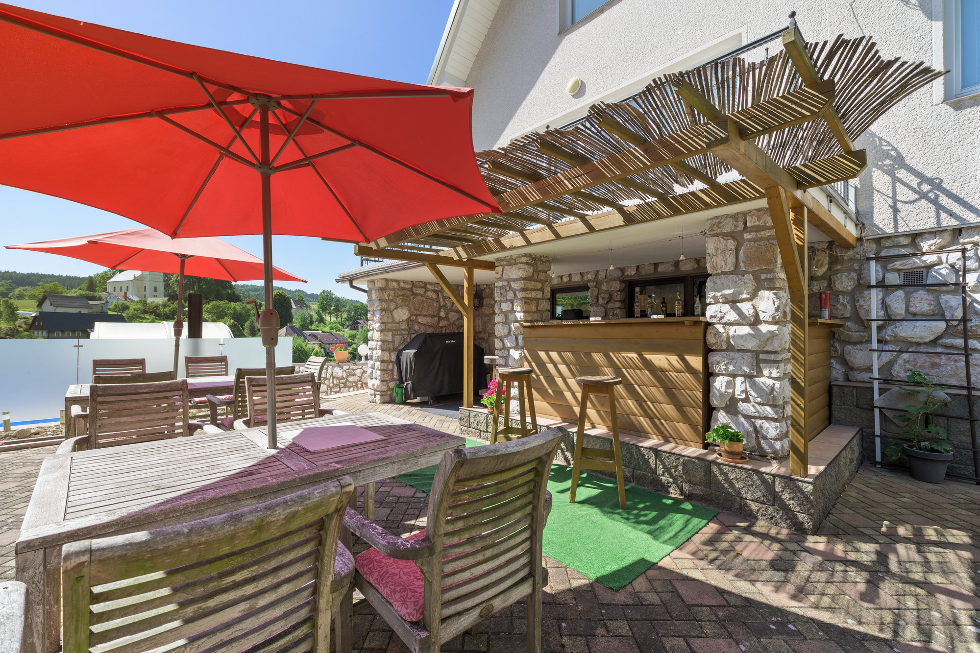 Návaznost na letní zahrádku u bazénu s venkovním barem, kde připravujeme míchané nápoje. Na noční zahřátí poslouží zahradní krb.